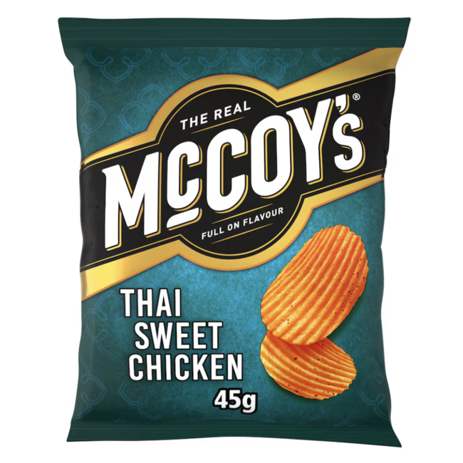 Spice up snack time with McCoy's Thai Sweet Chicken Grab Bag 45g. These thick-cut, ridge-packed crisps are bursting with irresistible Thai sweet chicken flavour—combining gentle heat, a touch of sweetness, and savoury goodness in every crunchy bite. Boldly seasoned and seriously satisfying, they deliver the signature McCoy’s crunch you love. Perfect for lunch breaks, road trips, or whenever cravings strike, this grab bag is small in size but huge on flavour.