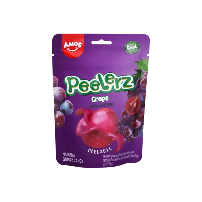 Amos Peelerz Grape 65 g are playful, peelable gummy candies bursting with rich, juicy grape flavor. Each gummy can be peeled before eating, adding a fun and interactive twist to snacking. Soft, chewy, and sweet, these fruit-slice-style treats look like real grapes and deliver a satisfying candy experience that’s perfect for sharing, gifting, or enjoying anytime you’re in the mood for something fruity and fun.