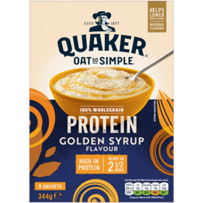 Verrijk uw groothandelsaanbod met Quaker Oat So Simple Protein Golden Syrup van Kellys Wholesale, de perfecte combinatie van gemak, voeding en smaak!