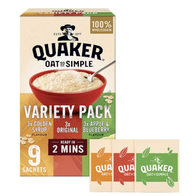 Quaker Oat So Simple Variety biedt een mix van verschillende smaakvarianten havermout in handige portiezakjes. De fijn gesneden havermout is snel en eenvoudig te bereiden en zorgt voor een warm ontbijt met afwisseling, geschikt voor thuisgebruik, werkplekken en gedeelde omgevingen.